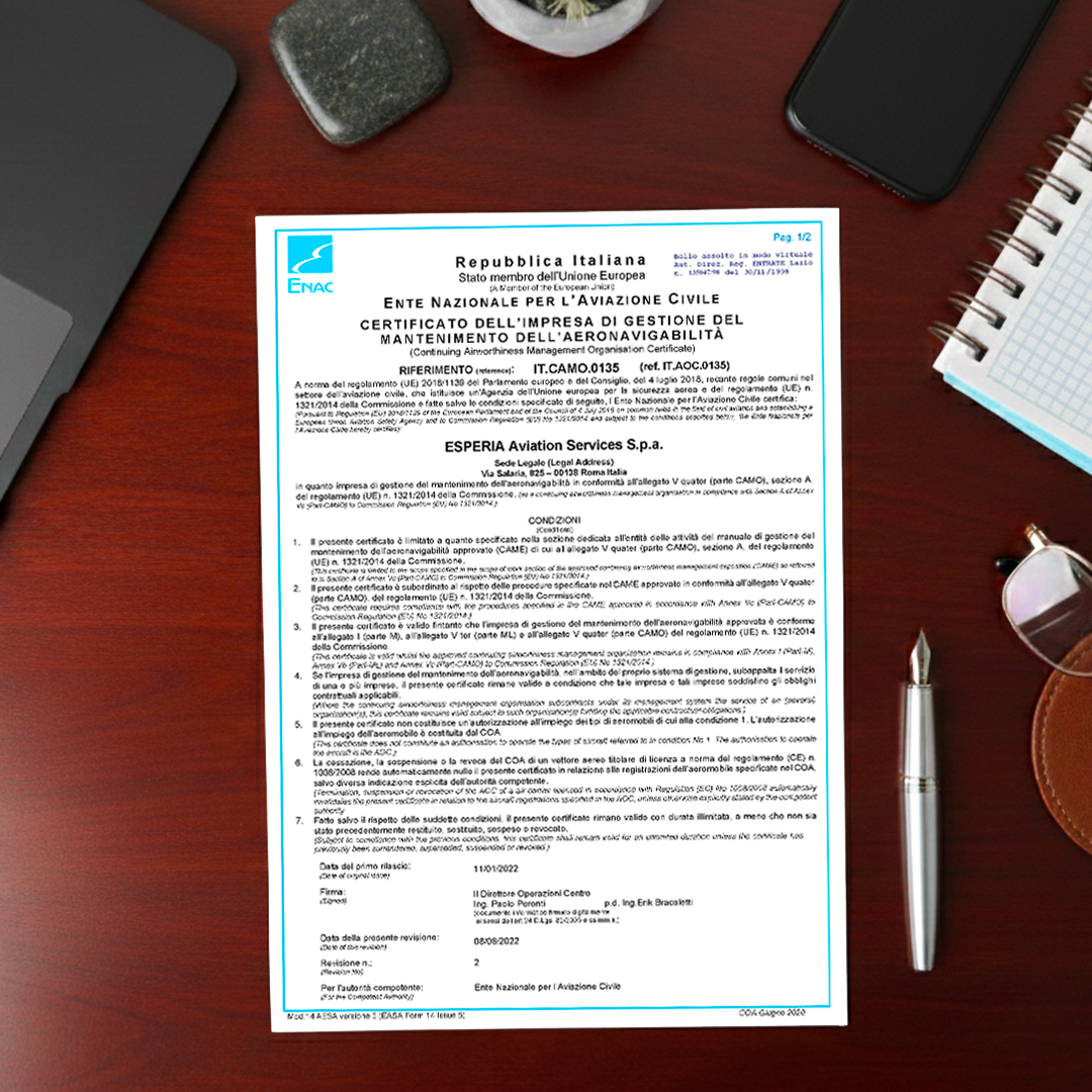 Il nostro certificato CAMO (Continuing Airworthiness Management Organisation) attesta la piena competenza nella gestione continua della navigabilità della flotta, in conformità ai requisiti della normativa europea 1321/2014 (Part CAMO e Part M) e successivi emendamenti.