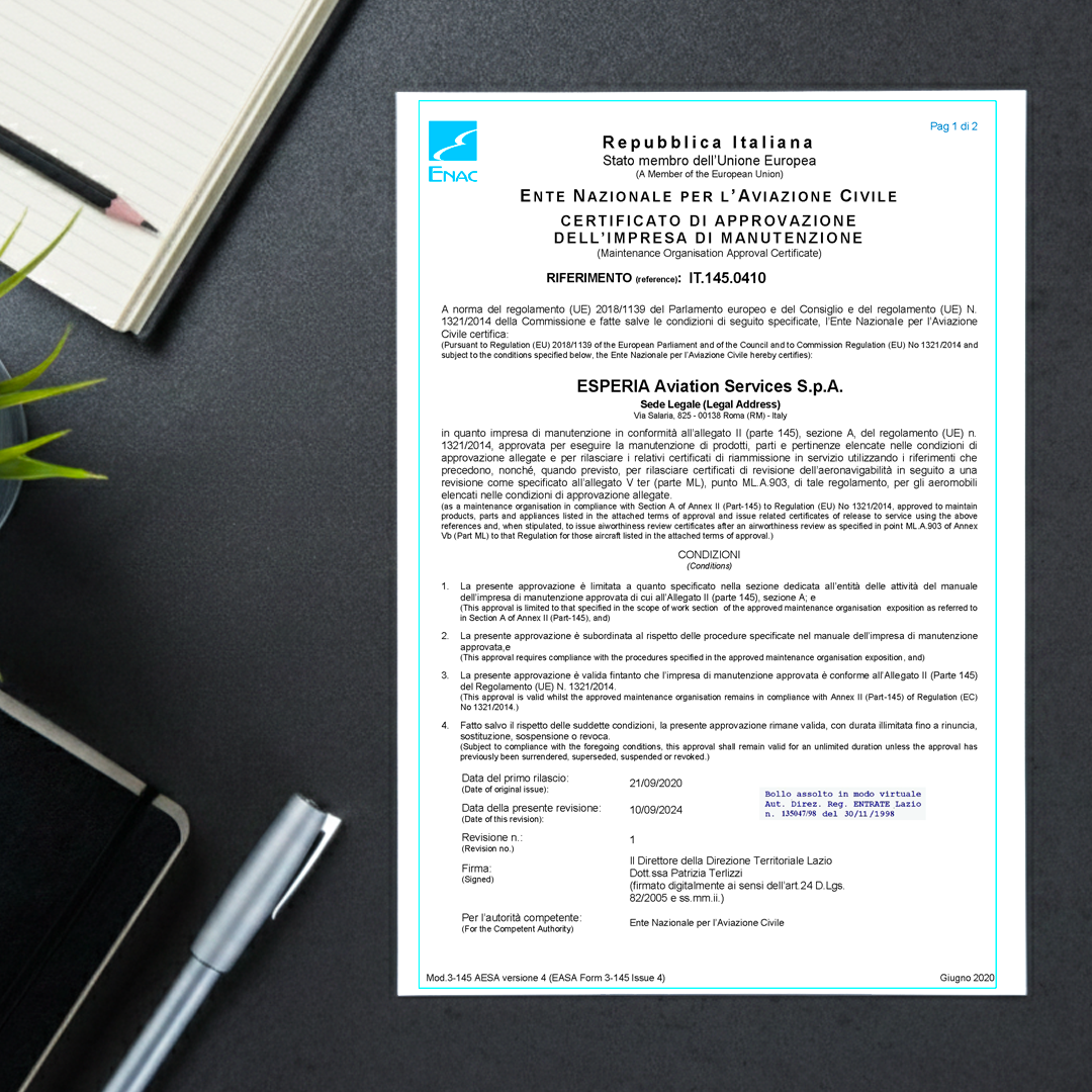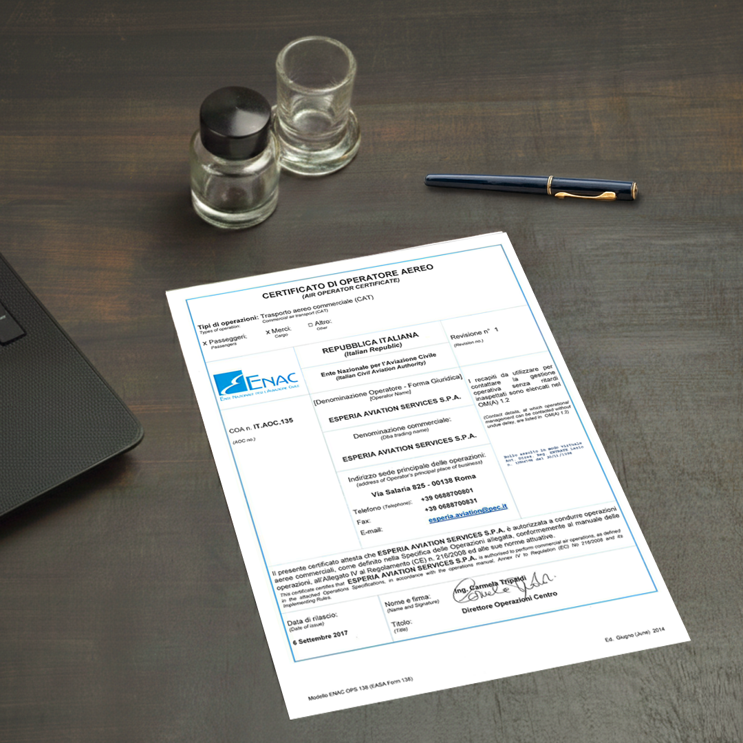 Esperia è riconosciuta come Operatore Aereo autorizzato dall’Autorità per l’Aviazione Civile, un’autorizzazione che consente l’esercizio di voli commerciali, in conformità ai requisiti della normativa europea 965/2012 e successivi emendamenti.